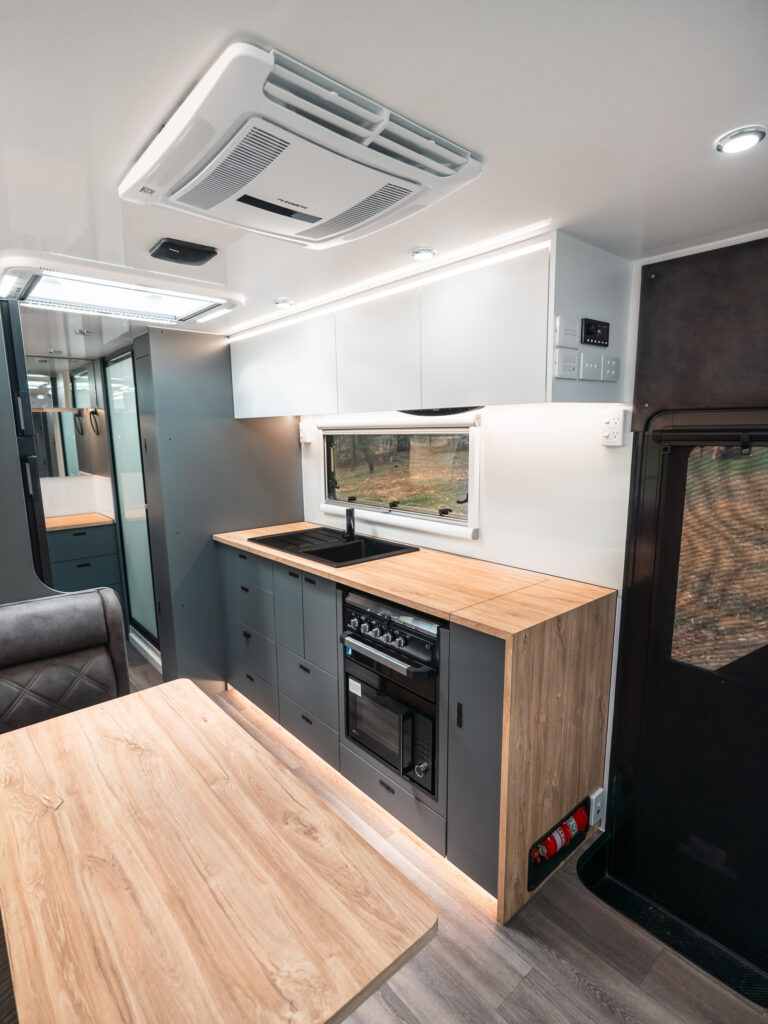 Built for off-road adventures, the cabinetry is interlocking for added strength, and all drawers and cupboards are fitted with secure locking catches to handle rough terrain.